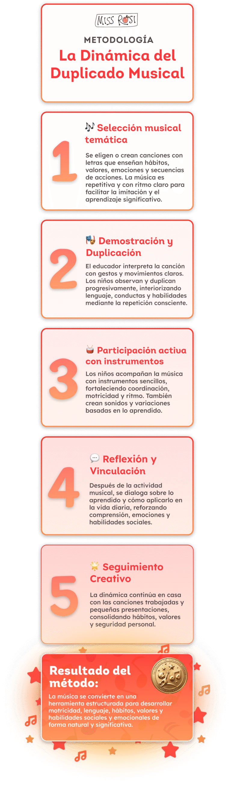 Fundadora de una metodología única, la «Dinámica del Duplicado Musical», Miss Rosi se dedica a impartir la alegría a través de la música, no solo entre los infantes sino también entre educadores y padres.. Su influencia se extiende desde el aula hasta reconocidas instituciones educativas, llevando innovación, emoción y un profundo amor por el aprendizaje donde sea que resuene su música.