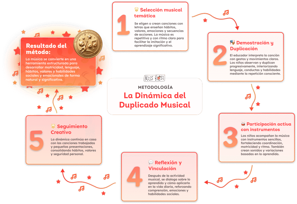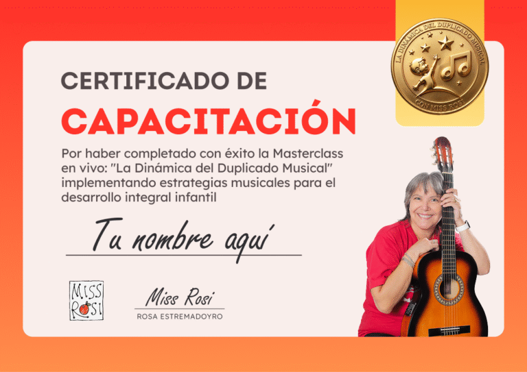Es una herramienta de gran valor curricular que certifica que has aprendido de primera mano la metodología de «La Dinámica del Duplicado Musical», la cual ha sido probada con éxito durante más de 33 años en nidos y colegios.