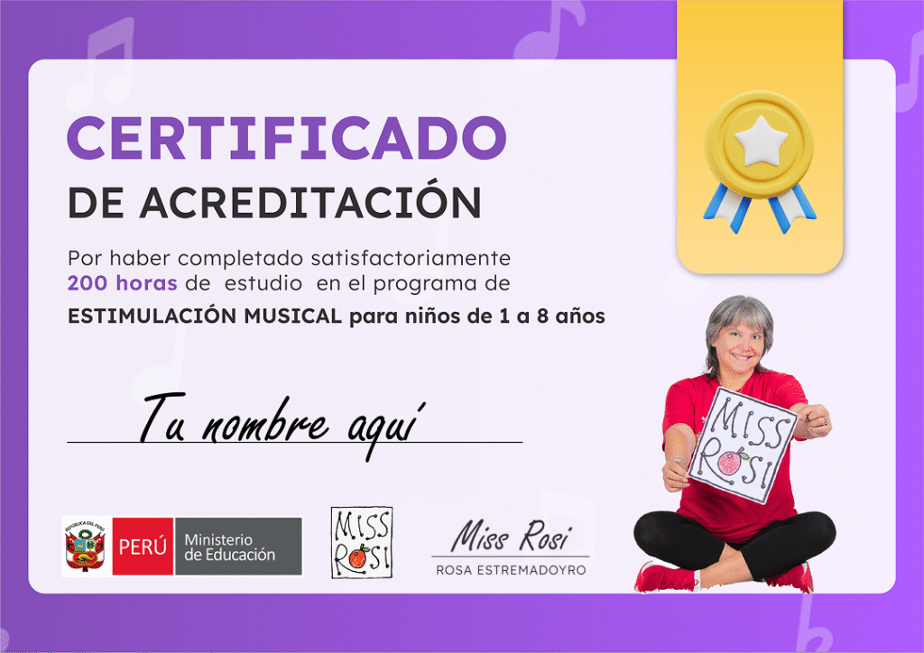 El certificado es acreditado por el gobierno peruano y por 200 horas de estudio en estimulación musical. Válido para presentarlo internacionalmente. Te servirá para acompañar tu currículum y darle mayor peso, cotizar mejor tu trabajo profesional o también iniciar un nuevo negocio de educación, ya que podrás trabajar utilizando las mismas estrategias musicales que ya están 100% probadas por mi en nidos y colegios.